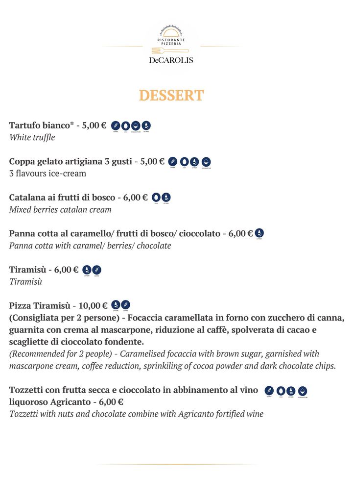 Il menù dei dessert del ristorante pizzeria De Carolis di Torgiano offre una dolce conclusione al pasto, con una selezione di prelibatezze che celebrano la tradizione pasticcera italiana.